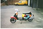 below my 1970 lambretta with 240cc engine, yamaha piston, alloy reed valve nicosil barrel, 34 mil amal carb, 94 MPH at avon park drag strip in the eighties