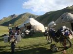 After Sary-Celek I will be heading back towards Kazakhstan and Jan will be heading for Uzbekistan. Arrived mid afternoon could not get into the park, not a clue why but the guard said neit so found a yurt and settled down for the night. I have not eaten for over 24 hours and dont feel hungry people would pay a small fortune for this diet. Beautiful lake but too crowded to enjoy. All the Kygys wanted to have their picture taken with us we obliged for about 20 plus different pictures then moved on. A few spoke English and asked us why we wanted to visit Kyrgyzstan, I tried to explain but the Kyrgys could not understand. I suppose life is tough for them,so the concept of making it tougher does not make sense.  They kept asking my age I think they thought I was too old for messing about on bikes!!!  The area around Sary-Celek has its own micro-climate cool and rain. The lakes and mountains are very similar to Switzerland.  Could not relax because of the constant hassling of the Kyrgys (hassled in a nice way and it might sound mean but after a while it starts to grate).