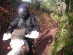 Mike seemed a pretty perky kind of chap, pitching up on a 200cc KTM two stroker and obviously very enthusiastic. It is generally considered that Newcastle supporters are consider hard core, stripped to the waste in the middle of winter stoically watching another trophyless season, however, trail riders are also made of some pretty stern stuff as Mike pitched up in a shirt and motocross top and jeans! Still being an ex-marine, I guess putting your body through various forms of pain is considered routine and riding Devon lanes in mid winter armed with only a couple of millimetres of denim is going to hurt.... We set off up the lane, relatively routine in summer, but it runs down to the bottom of the hill and the depression fills with water over winter and so we gave the bikes and Mikes jeans a goodsoaking from the off. Mike's other bike is some mentalist Kwacker with about 5 times the power of my Serow and he's not ridden off road for over a decade, but he was pretty competent partly owing to the large amount of off road mountain bike riding he does, so his balance is fine, it's just the fine throttle control that needs refinement. We rode up through Cotton Farm, Way Village and down through Grantland which include a bit of a ride along a very swollen stream with the usual slippery stones ensuring maximum concentration is required to avoid a dunking. I rode through first and sparked up the video eagerly awaiting my victim to follow through. Mike had already showed that falling off held no fear to him and his jeans were still remarkably dry. He cleaned the stream without a hint of a wobble - bugger! Paul followed and but for a tiny wobble also failed to provide the £250 YBF moment.