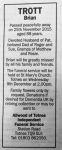 "The death of Brian Trott had been reported in the local papers. Brian was well known to many of our members for a variety of reasons. His funeral is to be held at St Marys , Totnes at 2.00pm on Wednesday the 10th December. Any members wishing to pay their respects would be appreciated by family."