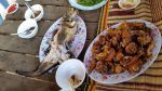 We stopped off at a fruit stall where we tried pretty well everything the lady had on sale, for very little money. We also stopped at a few other locations along the side of the road:- a stone carver's, a rubber plantation, and a palm wine stall - wouldn't rush back to that one! Palm wine must be an acquired taste, but I can't see me ever acquiring it. We took a detour across some fields, across a bridge, over some dykes and then across a reservoir dam before stopping for lunch. This consisted of a huge fish, a whole chicken or 2, feet, head and all - very tasty, and another dish which had the heart, gizzard etc. in it. That was the only one I could eat as my stomach had been dodgy all day. After lunch, most of the roads were horrendously dusty, with the road disappearing regularly for myself at the back of the group, especially when a lorry came the other way. Arrived at our hotel next to the Mekong around 6pm, filthy and dusty, so got in and washed the worst of the dust out of our kit. Then went out to the market and ate at a French-owned restaurant just outside the hotel. Entree (not ordered) was brawn, which was a surprise, but it was all I could eat apart from some bread and butter. Dinner was accompanied by a jug or 2 of Cambodia lager ($7 for 3 litres? Why wouldn't you?) It's a noisy part of town, but I need to catch up on my sleep, so I've bailed early tonight. Andy & Mel decided to go to a night club. I dipped out due to uncertain stomach troubles. They were both passengers on a single scooter which must have been a struggle for the bike!