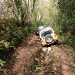 3 4x4's stuck with the rear vehicle having just burnt his clutch out trying to get out, having realised that this route really does get quite narrow ....