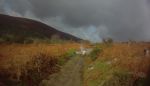 We could see for miles from the start of the byway down to Leighon and we were blessed with splendid views including a bright rainbow below a solitary cloud. There was a fair bit of water in the ford on the heavy goods vehicle route into North Bovey for those vehicles too wide for the long narrow bridge on the tarmac road, but seeing no water going over the stepping stones told me it was safe enough. I usually stop on the beach to film the other riders but the CRM stalled just short of there. Mattyboy was nearly caught out when I restarted and then stopped again almost immediately. Nobody actually toppled and although there may have been teetering there was no big splash. I caught a glimpse of Bovey castle through the hedge above Yarde cross before skirting a too clean white car partially obstructing the byway to Langdon. One large boulder dislodged by 4x4 use of the narrow lane lies on its own at one end but the other is a technical challenge of rocks and roots in a dark deep steep section before the farm where a fine collection of skulls graces the gatepost. Easdon byway around the oposite side of the high ground is comparatively simple but the gorse is encroaching making it narrower. Storm erosion on the climb to the gate from the cattle grid has made this short section of Bonehill down lane quite interesting with an intimidating step onto one remaining diagonal slab of the original tarmac. The last puddle is the deepest and although I slowed down for it Mattyboy either didn't notice or didn't care.