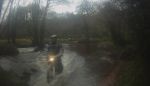 The ford across the Walla brook was deep enough to hide all the stepping stones only hinted at by the white water going over them. John had a moment or two and looked like he was using his legs as oars while crossing, but no trout were tickled.A lady leading a horse thanked us for stopping our engines as we passed the farm before several miles of picturesque tarmac made slightly more interesting by a small black calf suddenly racing along the tarmac next to for a while. The dog raised its head as if to say hello at Broadgates but did not get up. If you let it it will throw branches or balls under your bike to try getting you to play with it if you linger. I bumped the CRM over the log in the gateway and other took the safe route around. It is nice to see a black and white county road sign on the gate at the bottom of the Lych way road at East Shallowford where I made a pigs ear of dismounting for the top gate and had to pick the bike up again. No drama crossing the concrete ford at Ponsworthy. The gate leading into the SSSI at Blackadon was open and we coasted down the off camber slope above the steep wooded slope before limboing under the fallen holly branch midway along the road at the bottom of the hill. The car parks at Spitchwick remain closed but a small space is marked for disabled vehicles. More prickly gorse forced a detour as we crossed Green down while the younger calves ran about watched by their more placid parents. The rocky climb into Holne is great fun on a CRM in third gear hanging on tight. Summerhill cross lanes undulating surface preceded Bowden hill's muddy ruts which brought us into the centre of Ashburton. Visibility is poor exiting the short gravelly road below Pitley farm but we met no traffic on Gale road's muddy long deep puddles. Splashing through the puddle in the dip then squelching through the off camber mud to Goodstone preceded a short unrecorded road from Rentor view to Gale hill and we rode Holbeam lane at the second attempt. We splashed through the picturesque ford