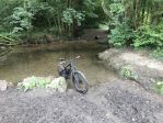 I still kept enough speed to crest the last rise below and hear the tyres leave the ground and rolled silently motor idle above 15.5 mph with a steady 17.5 mph thanks to gravity and only touched the brakes to avoid splashing anyone at the ford but was able to jump the water unimpeded to reach the gate. A cheerful silver haired woman wearing a bra as a bikini top rushed over from the barbecue picnic encampment of wind breaks, gazebo tent and assorted furniture to hold open and close the gate for me while two kids who had obviously been paddling by their attire paused their play to watch.