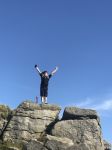We stopped atop the cliff overlooking Foggintor quarry and took a break basking in the sun enjoying a slight breeze while bikini clad bathers took to the water in the lake below.The Tavistock lane Bridleway begins beside the Plume of Feathers inn heading almost dead straight south into the moorland wilderness for several miles seen here from on top of South Hessary tor I climbed up to rock the logan stone which drums its echo across the landscape thumping on top of the tor. David shouted 'reach for the sky!' and his pic is above this post. We passed some exhausted looking sqaddies with huge packs resting standing upWe met a pedal powered mountain biker who had just fixed a snake bite pinch puncture at the first bend at Nun's cross and paused for a picAfter winding our way to the highest point on our ride at Eylesbarrow Tin Mine we stopped to admire the extensive view before the long descent over rocky boulders punctuated by sharp stone edged drainage channels. Tavistock lane apparently carries 30,000 ramblers and 10,000 mountain bikers every year and has been allocated £150,000 for repairs which have so far transformed a bit more than half of the five mile Princetown - Nun's cross - Scout Hut route from Dartmoor bog to wheelchair friendly track, with occasional granite outcrops and drainage ditches just to keep things interesting. The two mile rocky descent from Eylesbarrow to the Scout Hut will be sorely missed by the mountain bikers when repairs are complete.