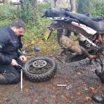 Onwards, and at this point the skies opened and it started to heavy shower on us. On through Avonwick and up through the boggy field which was very sideways slip-slidy which was fun. Culver lane was a nice challenge but when the 1290 got to the top the rear was punctured so a quick tube swap and we were on our way again. Rattery then Slatey Corner going down (never, in all my years riding, have I ever ridden this lane in this direction) Ben had a gentle off on said Slatey corner and needed to tweak his bars back central at the end of the lane but then we were off again. Some slippery lanes around Staverton and Baddaford then down Suicide Alley at Buckfastleigh before cutting back to Pridhamsleigh and the nice long lane at Parkfield where we met some friendly walkers who thanked us for slowing up as we approached them. They also gave us a warning of a horse and rider near the end of the lane. Heading further North we hit the lanes around Islington (not Simms today) but down the other side to the main road then up Tipley which was actually fairly easy and was even dry in places! Lunch stop at Bovey Tracy Co-op was about 13:00 and the rain had long since stopped and the weather was fairly decent.