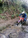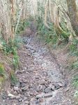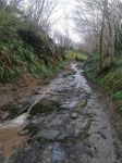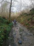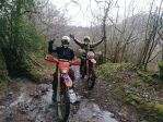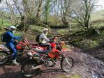 Heading NE out of South Molton our first lane was a lovely long lane (180-089) taking us to North Molton. We looped around the lanes at Heasley, 180-068 and 180-065 which had a little river splash before a slippery climb across a field to the farm. At Flitton Barton (180-080) there had been some tree work and the lane was completely blocked from 10meters in so we had to ride around. As we waited for the oncoming traffic to pass before we turned off the A399 into the woods on 180-076 the driver and female passenger of a Ford Mondeo seemed very excited to see us as they were waving at us in a crazy fashion. Maybe they thought we were someone they knew .or maybe there were just keen bikers. Who knows, but it made us all giggle in bemusement. At the first switch-back at the top of this lane we briefly stopped and Russ recounted that wed also stopped here all those years ago as we had to turn back due to a fallen tree that was impassable. I had the exact same recollection. Onwards passed Hunstone to Walscott then down a fabulous and gnarly lane to Newtown Bridge. I remembered this lane from back along as it was very distinctive - bedrock with large rocky crags and lots of flowing water which made the rocks really slippery. A great challenge of bike control. At the bottom and over the small bridge before turning up into the woods on 180-063, Barton Lane which also had a lot of exposed bedrock. Momentum was key here but both Russ and Damian got caught out resulting in a tricky and very steep hill start. Still, we all made it to the top. Onwards to Haxton Down Lane (180-046 and 045) then a lovely stoney climb through the woods on 180-028. As we approached Loxhore and 180-200 our luck ran out with the weather and we had our first rain shower of the day but it was short lived.