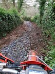 From here it was onwards towards South Brent where after crossing through the underpass under the A38 on Portford Lane the uphill tarmac backroad was really badly eroded along one edge from water erosion, so much so there were traffic cones to warn drivers as they'd definitely lose the side of their car down there! Back under the A38 and heading towards the scrap yard at South Brent and the duo of lanes that led us into South Brent, the first lane of which is becoming really rocky and washed out and the second which had some tricky off-camber slab rock which looked really greasy and slippery so the front brake was left well alone!