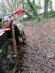 Pridhamsleigh was next which always spooks me with its off-chamber start to this lane - I don't like riding the higher line on the left but riding the low line on the right I feel like I could easily end up in the bushes and the field below. Onwards to Parkfield then Forder Green where we met our first horse of the day. Engines off, a brief pleasant exchange, then we both went on our merry way. We skirted Broadhempston heading towards Parsonage Lane - a hard-packed fast downhill with good visibility - which dropped us to the bottom of Tally Ho. Ascending Tally Ho we met a dog walker near the top so again killed the engines to allow her past with another friendly exchange. Onwards to the quadruple cross-over lanes at Red Post where we stopped in the centre crossroads for a chat and a choccy bar cos my stomach was rumbling!! Exiting south on the steep and rocky decent into Littlehempston the lane onto the main road was slippery as always but has 4-wheeled vehicle tracks in it which I'd never seen before.