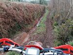 Pridhamsleigh was next which always spooks me with its off-chamber start to this lane - I don't like riding the higher line on the left but riding the low line on the right I feel like I could easily end up in the bushes and the field below. Onwards to Parkfield then Forder Green where we met our first horse of the day. Engines off, a brief pleasant exchange, then we both went on our merry way. We skirted Broadhempston heading towards Parsonage Lane - a hard-packed fast downhill with good visibility - which dropped us to the bottom of Tally Ho. Ascending Tally Ho we met a dog walker near the top so again killed the engines to allow her past with another friendly exchange. Onwards to the quadruple cross-over lanes at Red Post where we stopped in the centre crossroads for a chat and a choccy bar cos my stomach was rumbling!! Exiting south on the steep and rocky decent into Littlehempston the lane onto the main road was slippery as always but has 4-wheeled vehicle tracks in it which I'd never seen before.